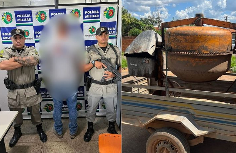Equipe da Polícia Militar após tomar conhecimento de um furto de uma betoneira diligenciou e logrou êxito em prender o autor do furto e identificar o receptador e realizar a restituição do bem á vítima.