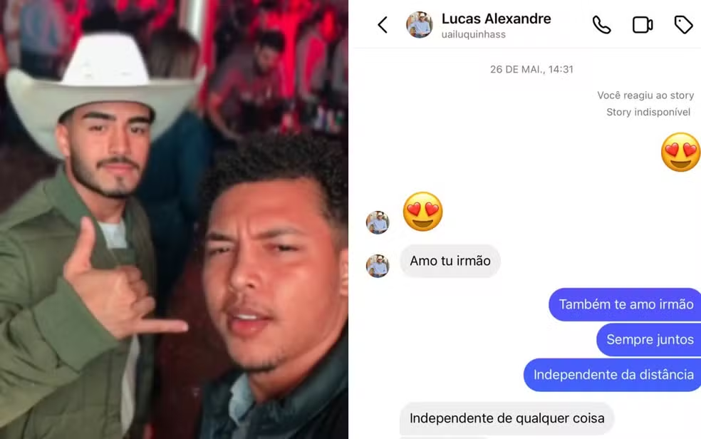 Foto do lado esquerdo mostra Lucas Alexandre Barros de Sousa, influencer de 22 anos. Foto do lado direito mostra a última dele com o amigo Glauber Pires — Foto: Reprodução/Redes Sociais e Arquivo pessoal/Glauber Pires