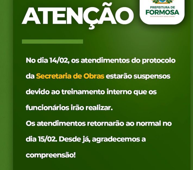 No dia 14/02, os atendimentos do protocolo da Secretaria de Obras estarão suspensos devido ao treinamento interno que os funcionários irão realizar. Os atendimentos retornarão ao normal no dia 15/02. Desde já, agradecemos a compreensão!