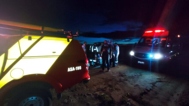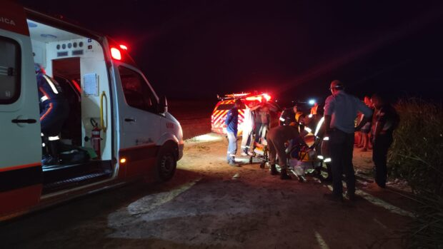 A vítima se encontrava consciente e responsiva a estímulo verbal. Os bombeiros procederam com a imobilização e os atendimentos de primeiros socorros da vítima que apresentava fratura exposta em Membro Inferior Direito, escoriações em Membro Inferior Esquerdo, suspeita de fratura no ombro esquerdo e aparente sangramento na cabeça.