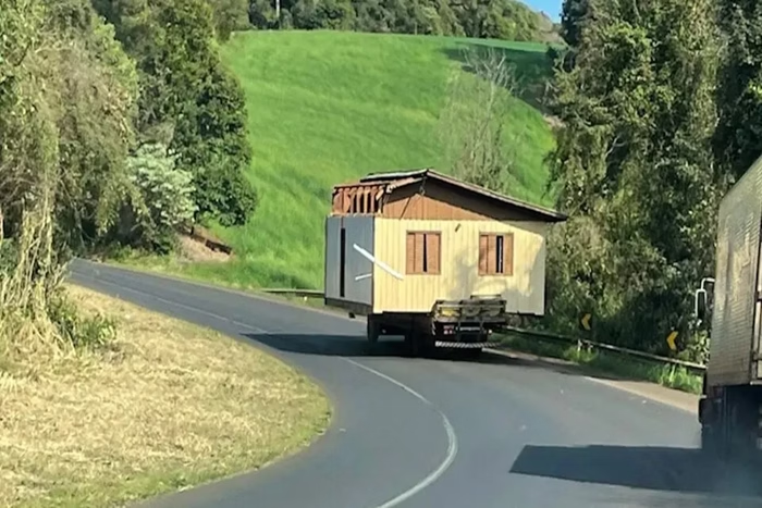 Um vídeo registrado no sábado (2/8) mostra uma casa de madeira sendo transportada inteira na carroceria de um caminhão na PR-473, entre Dois Vizinhos e Cruzeiro do Iguaçu, no sudoeste do Paraná. No registro, é possível ver a casa sendo levada em meio ao tráfego da rodovia, representando risco e pode ser caracterizado como direção perigosa, dependendo da avaliação das autoridades.