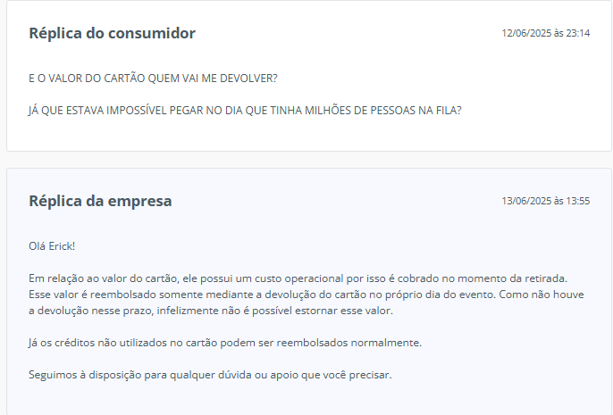 Ele lembra que cobrar pelo cartão físico não é proibido, mas pode ser abusivo quando as condições para devolução são inviáveis, como exigir a entrega no mesmo dia em filas enormes. E reforça: a responsabilidade é solidária entre o organizador do evento e a operadora do sistema de pagamento — não adianta um jogar a culpa no outro.