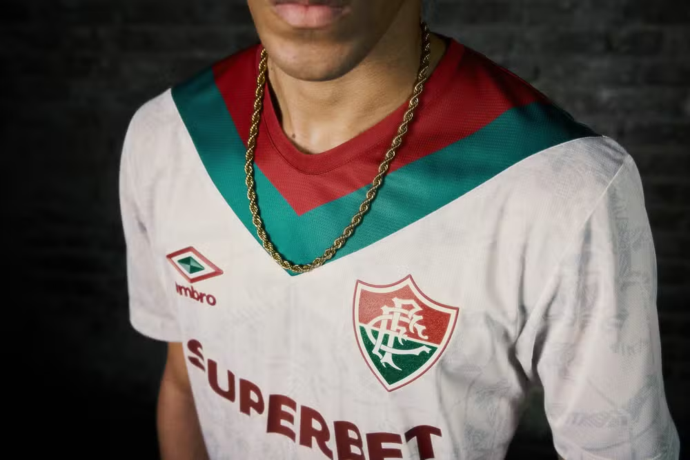 Nos detalhes, a gola será parecida com uma rolê, com uma linha dourada contornando a área. Na manga, os logotipos da Umbro são dourados. A camisa tem uma identidade reforçando a presença carioca do Fluminense.