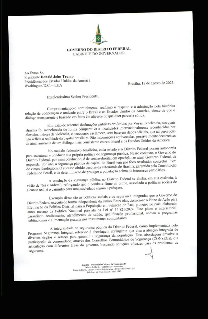 Na carta escrita a Trump, Ibaneis destaca que, “na atual gestão, foi alcançado o menor índice de homicídios dos últimos 48 anos, fruto do investimento na contratação de mais 5 mil servidores de segurança pública, na duplicação dos pontos de monitoramento eletrônico e outras ações”.