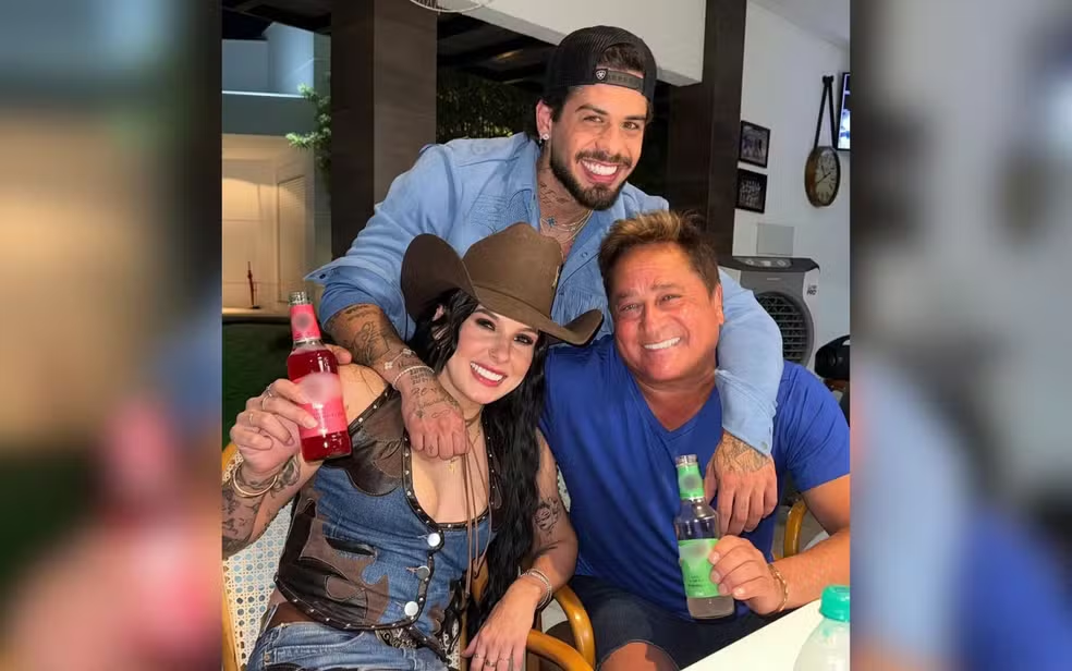 Na foto, a cantora e Leonardo aparecem segurando garrafas de bebida e sendo abraçados por Zé Felipe. Os dois ainda vestiam as roupas da gravação do clipe, com um estilo country em jeans e couro.