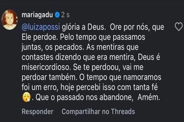 “Luiza Possi, glória a Deus. Ore por nós, que Ele perdoe. Pelo tempo que passamos juntas, os pecados. As mentiras que contastes dizendo que era mentira, Deus é misericordioso”, disparou.