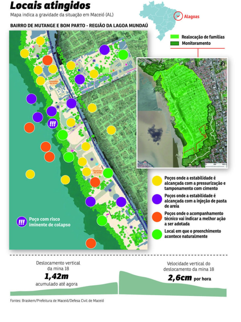 Em nota, a Defesa Civil de Maceió afirmou que o deslocamento vertical da mina permanece em alerta máximo devido ao risco iminente de colapso. “Estudos mostram um aumento significativo na movimentação do solo na Mina 18, indicando a possibilidade de rompimento e surgimento de um sinkhole (vazios de superfície que podem ocorrer no solo)”.