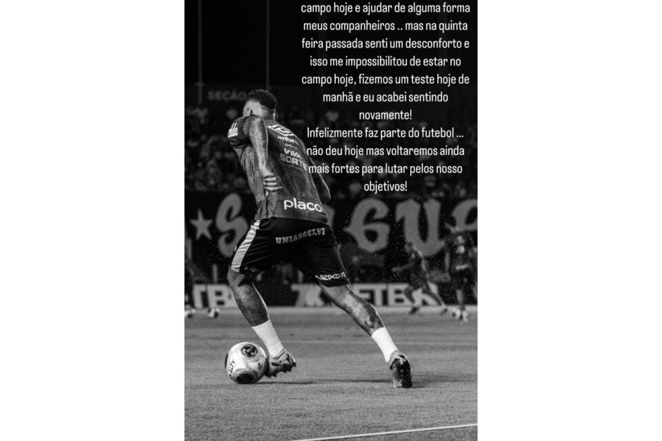 “Tudo o que eu queria era estar em campo hoje e ajudar de alguma forma meus companheiros… Mas na quinta-feira passada eu senti um desconforto e isso me impossibilitou de estar em campo hoje. Fizemos um teste hoje de manhã e eu acabei sentindo novamente! Infelizmente faz parte do futebol… Não deu hoje, mas voltaremos ainda mais fortes para lutar pelos nossos objetivos”, escreveu o craque.