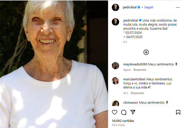 O jornalista e apresentador Pedro Bial anunciou, nesta sexta-feira (4), a morte de sua mãe, Susanne Bial, aos 101 anos. Ela havia completado aniversário no dia anterior, 3 de julho. A informação foi divulgada pelo próprio apresentador em publicação nas redes sociais.
