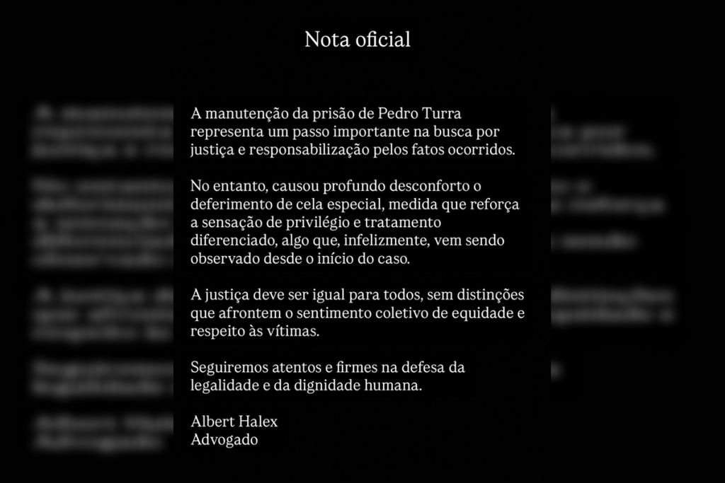 “Causou profundo desconforto o deferimento de cela especial, medida que reforça a sensação de privilégio e tratamento diferenciado, algo que, infelizmente vem sendo observado desde o início do caso. A Justiça deve ser igual para todos, sem distinções que afrontem o sentimento coletivo de equidade e respeito às vítimas“, afirmou Halex.