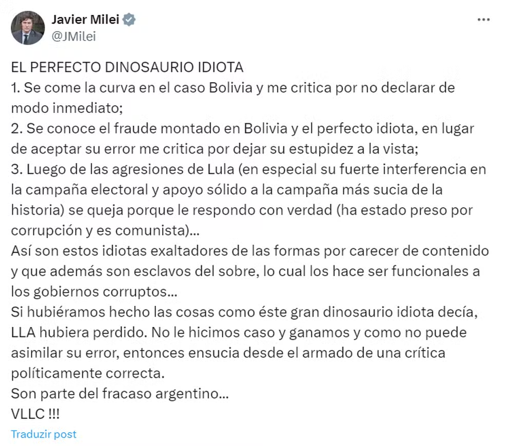 No post desta terça-feira (2), Milei se refere a um “perfeito dinossauro idiota”, a quem não nomeia. Em outro trecho, cita Lula dizendo que ele foi “preso por corrupção” e que é “comunista”.