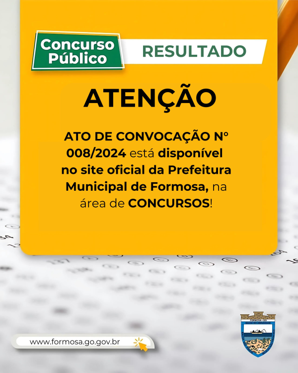 Prefeitura de Formosa faz novo edital de convocação de aprovados no Concurso Municipal Posted on by Joanna Confira o edital abaixo CONVOCAÇÃO N.º 008.24Baixar Compartilhe Facebook Twitter Linkedin Whatsapp