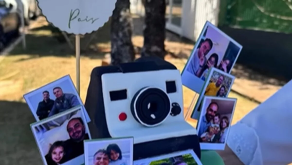 Michelle Bolsonaro entrega ao marido bolo com fotos da família (Foto: Reprodução – Redes Sociais)