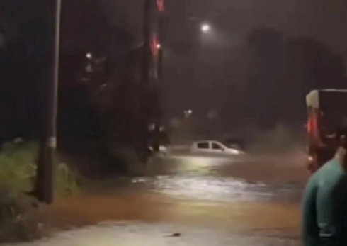 Após uma forte chuva, a correnteza que se formou acabou puxando o veículo em direção à elevação, da qual acabou caindo em um córrego.
